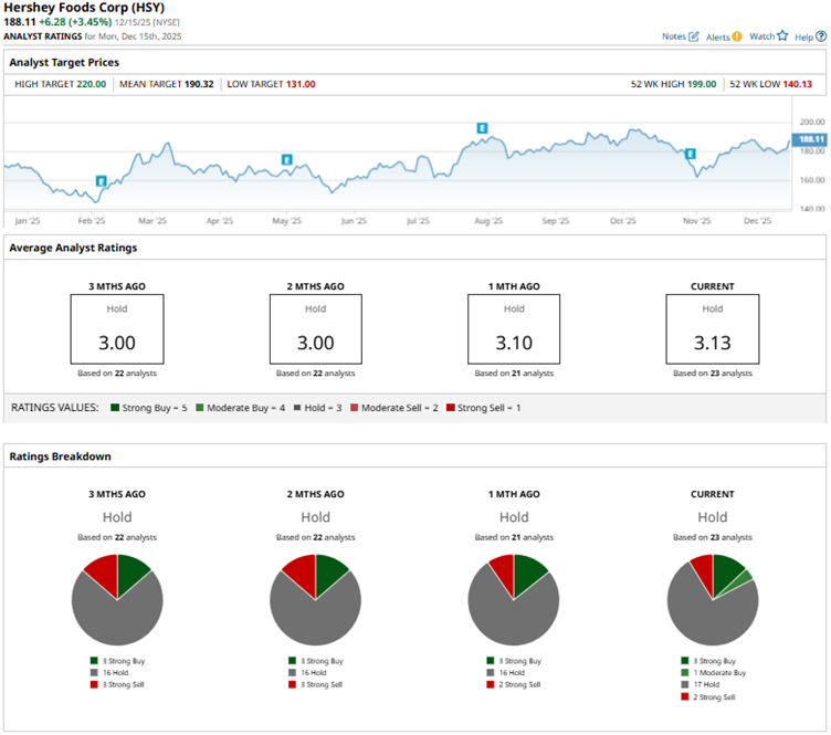 Analysts at Jefferies also resumed coverage on HSY stock with a “Hold” rating and a $181 price target. Jefferies analysts are taking a cautious stance, although the company has navigated high cocoa costs this year. While Hershey is recovering margins, its valuation may already reflect that.