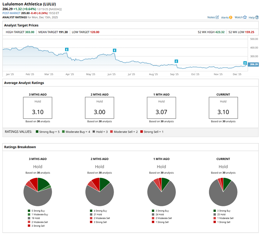 Wall Street remains measured in its stance on Lululemon. The stock currently carries a consensus “Hold” rating, reflecting a wait-and-see mood rather than outright confidence. Of the 30 analysts tracking the name, only three rate it a “Strong Buy,” while a majority of 25 analysts are on the sidelines with “Hold” recommendations. On the bearish end, one analyst has a “Moderate Sell” and another a “Strong Sell” rating.