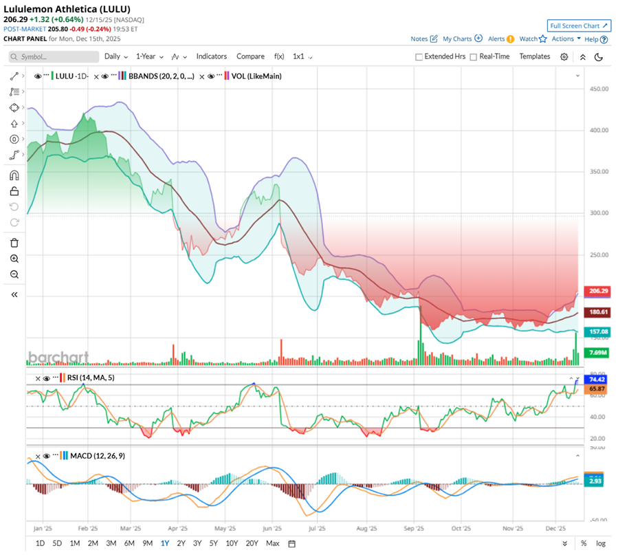 Most telling, the stock is trading above the upper Bollinger Band. That often flags overbought conditions, but it can also signal a powerful trend asserting itself. After a long fall, Lululemon’s chart is starting to look less like surrender and more like a stock trying to stand back up.