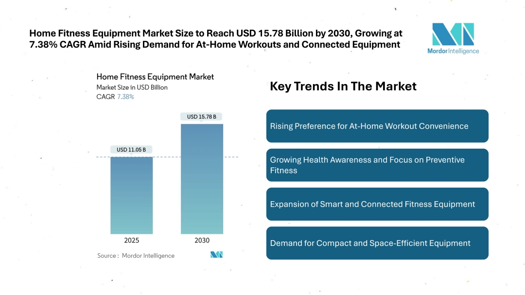According to Mordor Intelligence, the home fitness equipment market size is expected to reach USD 11.05 billion in 2025 and grow to USD 15.78 billion by 2030, registering a CAGR of 7.38% during the forecast period. This growth reflects sustained consumer demand for accessible fitness options that support long-term health goals while fitting into limited living spaces, especially in urban environments.