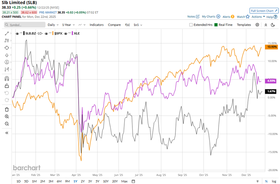 SLB stock has risen 4.1% over the past 52 weeks, lagging behind the S&P 500 Index's ($SPX) nearly 16% gain and the Energy Select Sector SPDR Fund's (XLE) 5.1% return over the same period.