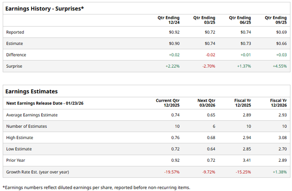 The Houston, Texas-based company is expected to announce its fiscal Q4 2025 results on Friday, Jan. 23. Ahead of this event, analysts predict SLB to report an adjusted EPS of $0.74, down 19.6% from the previous year's $0.92. It has surpassed Wall Street's bottom-line estimates in three of the past four quarters while missing on another occasion.