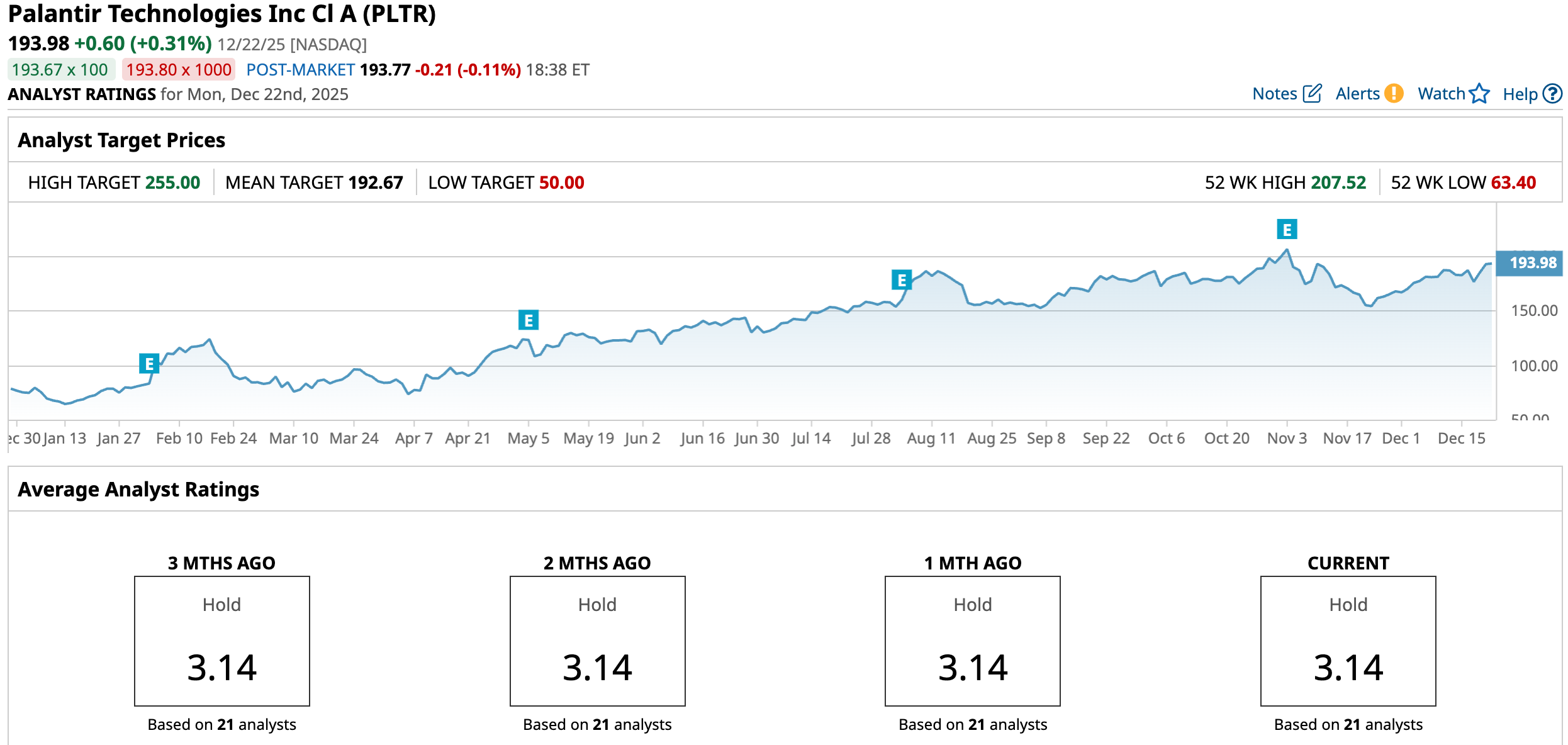 Wall Street analysts are taking a cautious stance on Palantir’s stock now, with a consensus “Hold” rating overall. Of the 21 analysts rating the stock, four analysts gave a “Strong Buy” rating, while a majority of 14 analysts are playing it safe with a “Hold” rating, one analyst gave a “Moderate Sell” rating, and two analysts gave a “Strong Sell” rating. The consensus price target of $193.67 represents a marginal downside from current levels. However, the Street-high price target of $255 indicates a 31.7% upside from current levels.