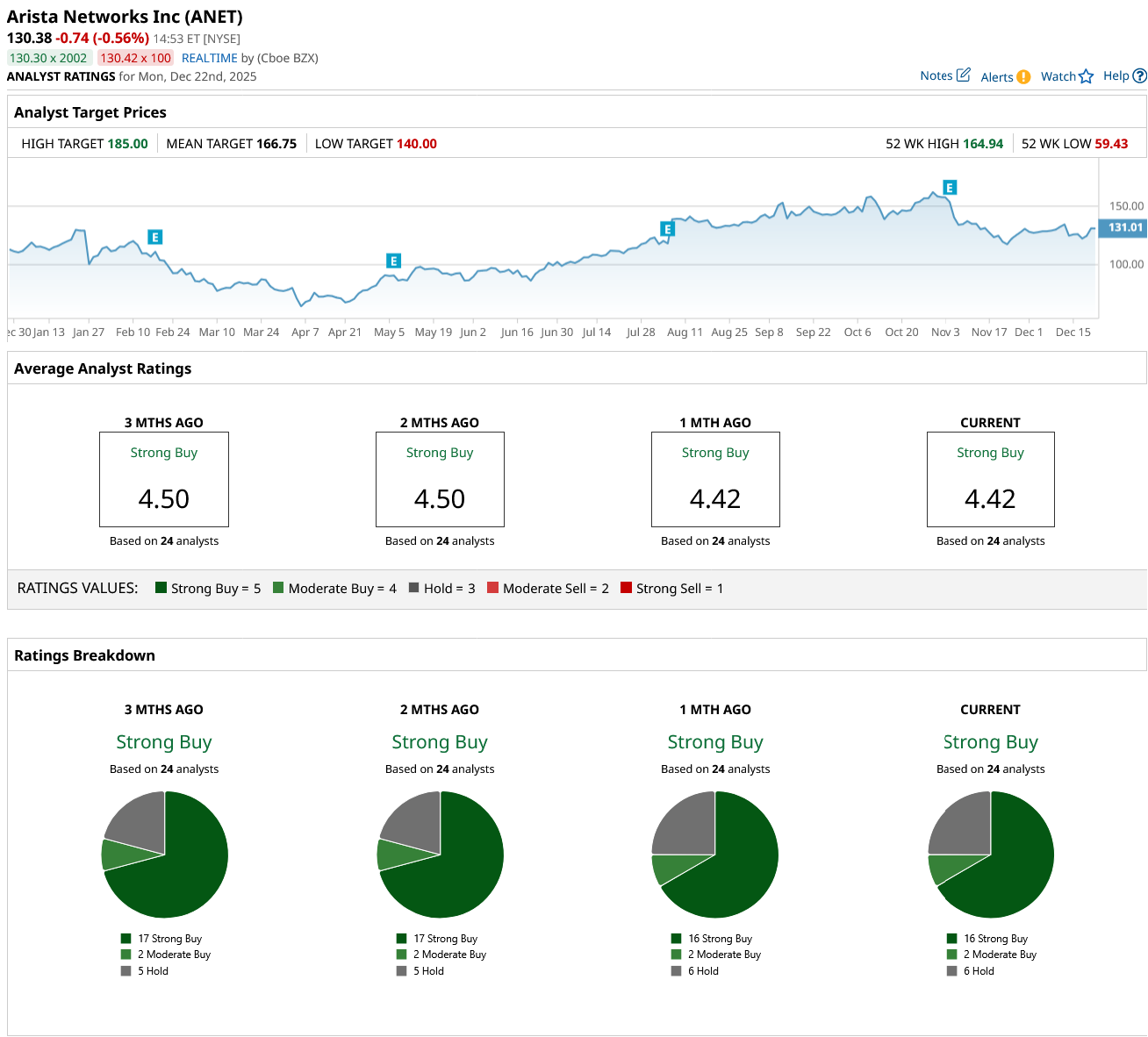 Overall, Wall Street rates Arista stock a “Strong Buy.” Out of the 24 analysts covering ANET stock, 16 have a “Strong Buy” recommendation, two rate it a “Moderate Buy,” and six suggest it’s a “Hold.”