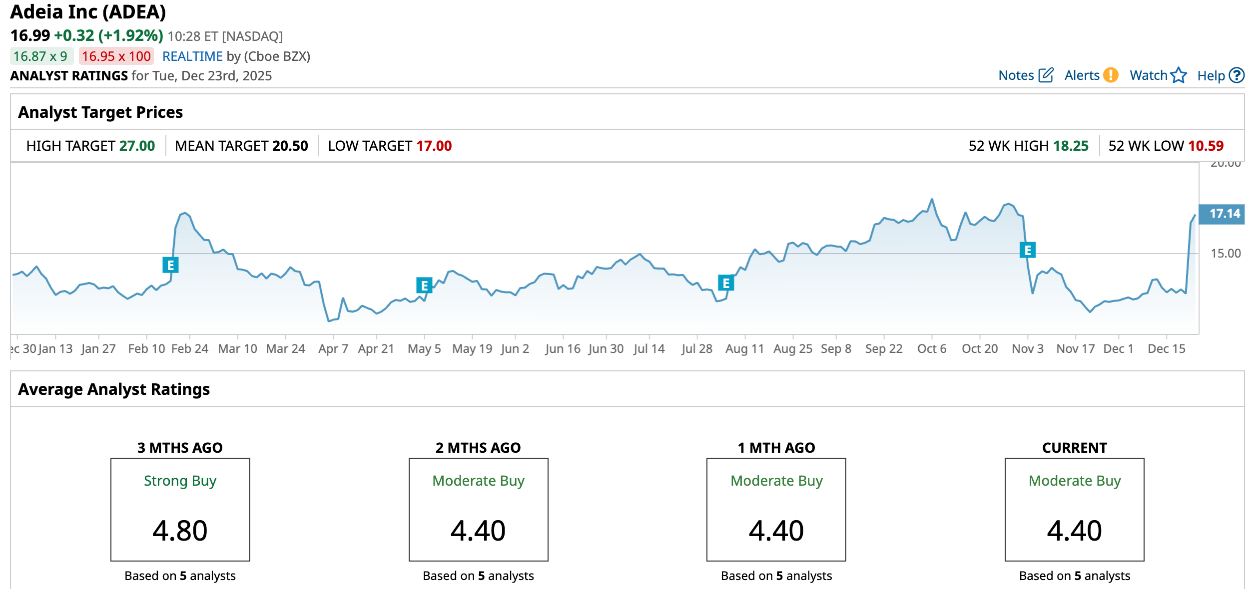 Amid strong sentiment, the stock reached a 52-week high of $18.25 in early October but is down 6.2% from that level. A likely key catalyst was Adeia’s announcement of a long-term IP license agreement with Altice USA, now rebranded as Optimum Communications (OPTU). This deal reinforced the value of Adeia’s IP portfolio and its ability to secure significant licensing partnerships, boosting investor optimism about future cash flows and growth.