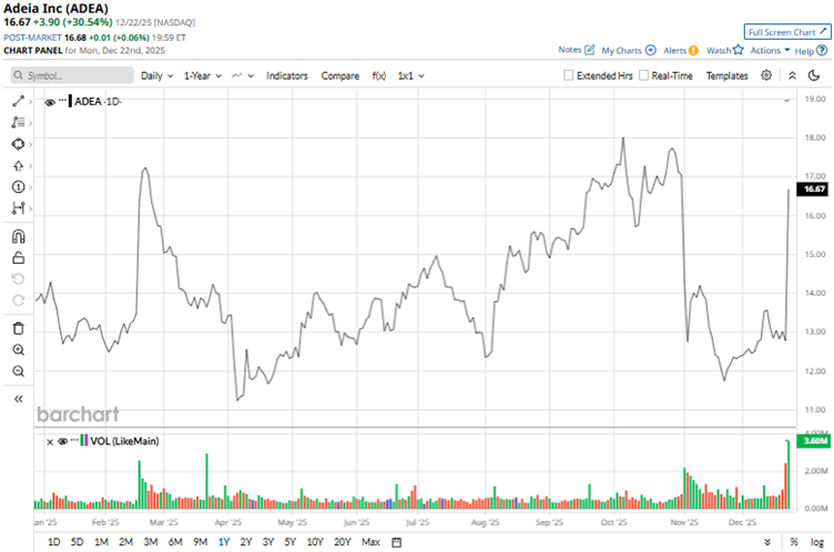 The agreement also resolves all outstanding litigation between the two companies. This news sent Adeia’s stock sharply higher, with the stock gaining 30.5% intraday on Dec. 22.