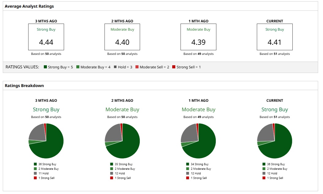While 36 analysts have assigned a “Strong Buy” rating, two and 12 analysts have a “Moderate Buy” and “Hold” rating, respectively. Only one analyst has assigned a “Strong Sell” rating.