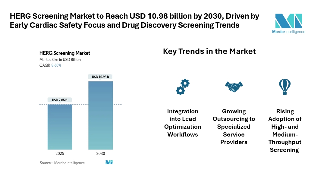 The hERG screening market size stands at USD 7.85 billion in 2025 and is forecast to reach USD 10.98 billion by 2030, expanding at a 8.60% CAGR. HERG screening is widely used to evaluate the potential risk of drug-induced cardiac arrhythmia, making it a routine requirement in preclinical safety workflows. Regulatory expectations around cardiotoxicity screening and the need to reduce late-stage drug failures continue to support the relevance of this market across global research settings.