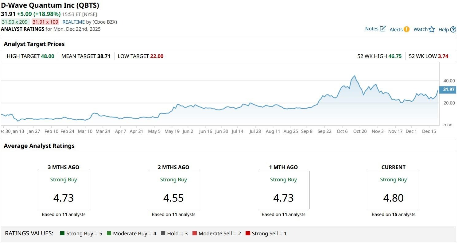 According to Barchart, the consensus rating on D-Wave stock remains at “Strong Buy” with price targets going as high as $48, indicating potential for a more than 65% rally in the coming year.
