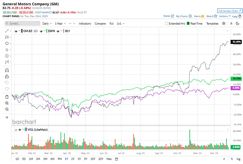 GM stock prices have gained 57.4% over the past 52 weeks, outpacing the S&P 500 Index’s ($SPX) 15.7% returns and the Consumer Discretionary Select Sector SPDR Fund’s (XLY) 6.6% gains during the same time frame.
