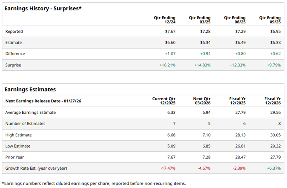 The Bethesda, Maryland-based company is expected to announce its fiscal Q4 2025 results soon. Ahead of this event, analysts forecast LMT to report a profit of $6.33 per share, down 17.5% from $7.67 per share in the year-ago quarter. However, it has surpassed Wall Street's earnings estimates in the last four quarters.