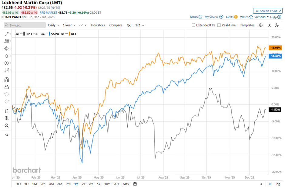 Shares of LMT have declined marginally over the past 52 weeks, lagging behind both the S&P 500 Index's ($SPX) 15.7% gain and the State Street Industrial Select Sector SPDR ETF’s (XLI) 17.9% increase over the same period.