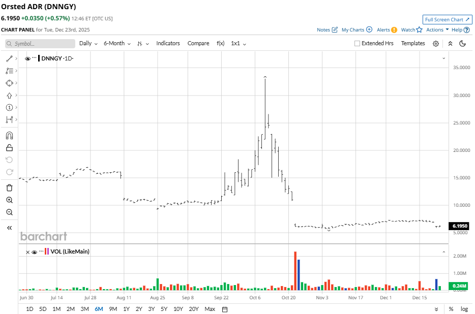 Orsted ADR trades just above its 52‑week low of about $5.75 and far below the $33 high, reflecting a deep de-rating after capital raises and guidance cuts. Over the past five days, the stock has declined by roughly 12.8%, approximately 4.63% lower over the last month, and is down nearly 51.38% over the last three months, resulting in a year-to-date (YTD) loss of close to 59% and a decline of over 12 months.