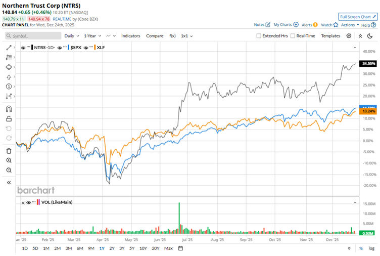 The shares have delivered a standout performance, jumping 35.8% over the past year, more than doubling the S&P 500’s ($SPX) 14.5% gain over the same period. Northern Trust has also pulled well ahead of its financial-sector peers, comfortably beating the Financial Select Sector SPDR Fund (XLF), which rose 13.5% over the past year.