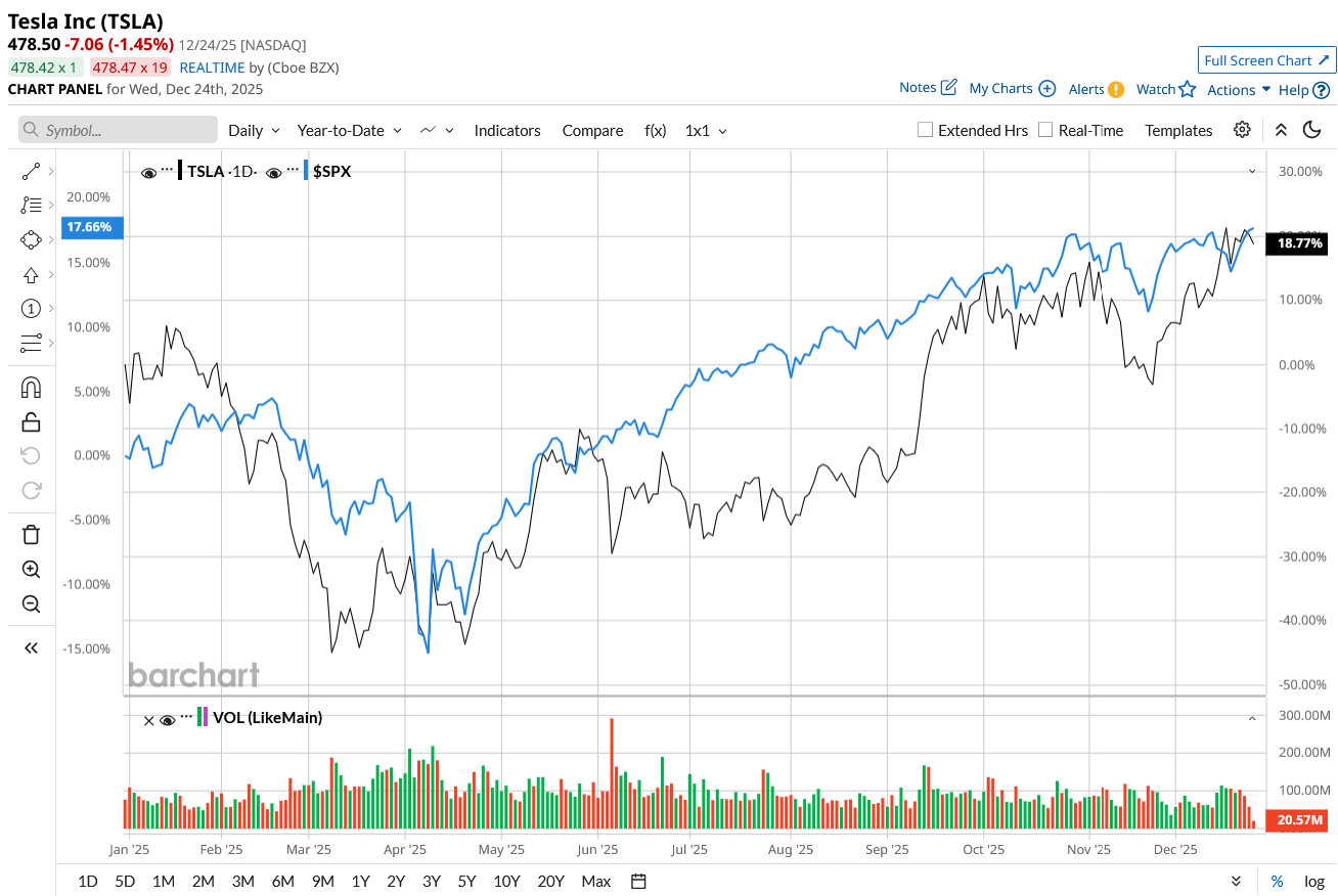 According to disclosures, Wood sold 23,110 shares of Tesla through ARK Invest’s flagship ARK Innovation ETF (ARKK), generating roughly $11.2 million. The sale came shortly after Tesla shares pulled back from record highs earlier in the week. Importantly, this was not a wholesale exit. ARK remains a major Tesla shareholder, with Tesla holding 11.9% weightage, and the transaction appears to be a partial profit-taking move rather than a change in Wood’s long-term thesis. Even after the sale, TSLA stock is up 18% year-to-date (YTD), slightly outperforming the broader market.