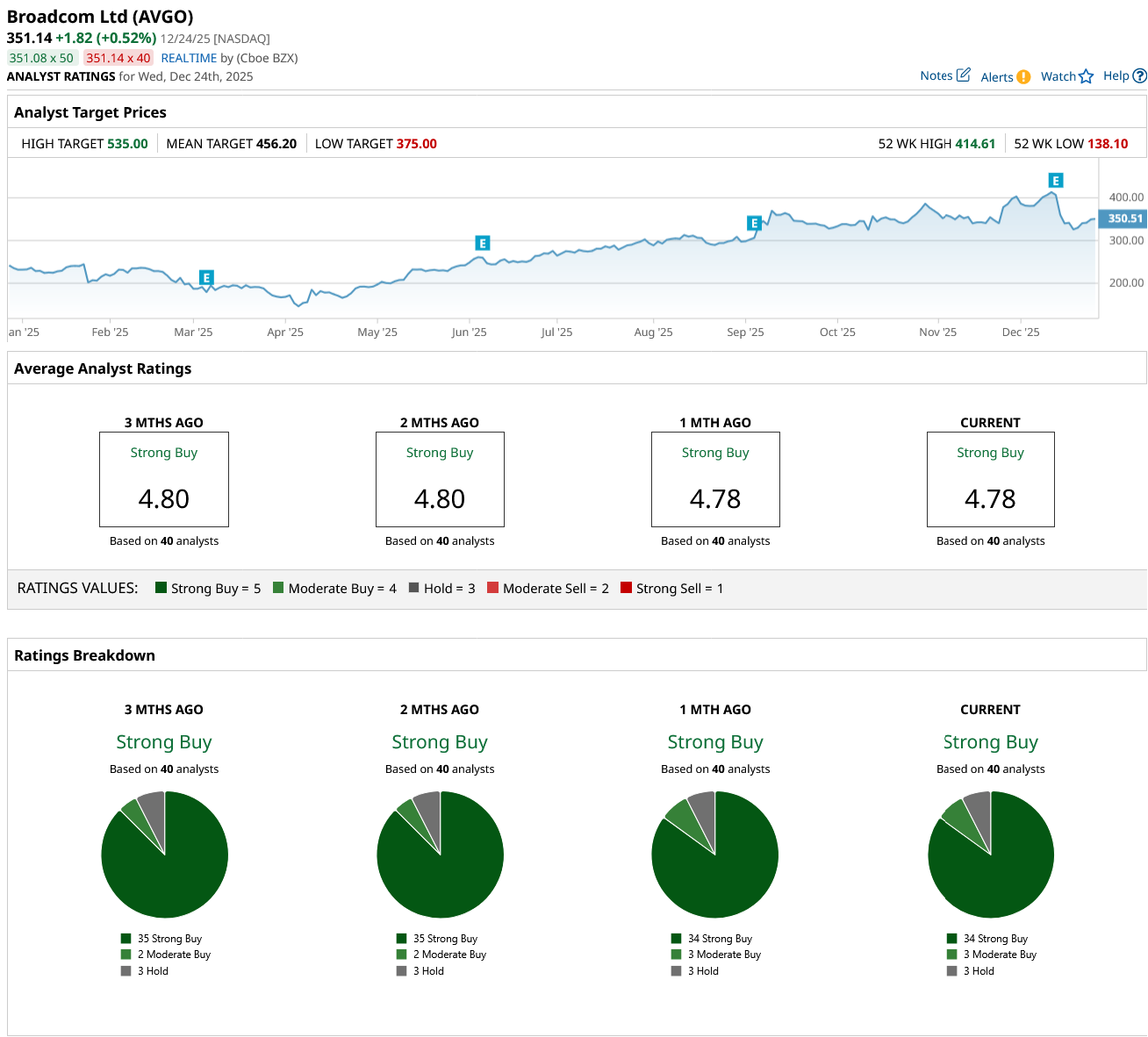 Out of the 40 analysts covering AVGO stock, 34 recommend “Strong Buy,” three recommend “Moderate Buy,” and three recommend “Hold.” The average AVGO stock price target is $456.20, above the current price of $351.