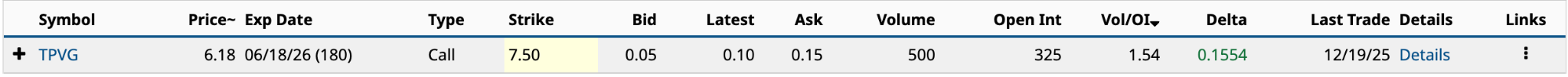 As a result of these two risks, TPVG stock is down nearly 15% in 2025. With six months until expiration, you’ve got plenty of time to see if your small $15 contrarian bet pays off.