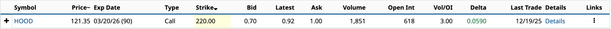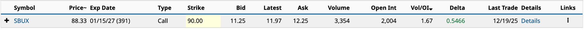 Lastly, we have the Starbucks (SBUX) Jan. 15/2027 $90 call, which doesn’t expire for another year and a month. A lot could happen to the world’s largest coffee chain in that time. The expected move is $19.16, up or down, significantly higher than the $13.92 move needed to hit the $102.25 breakeven.