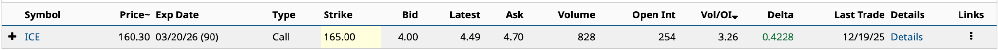 The March 20 $165 call had an ask price of $4.70 at the Dec. 19 close. That’s just 2.9% of its $160.30 closing share price. While the odds of the share price being above the $169.70 breakeven at expiration are about 30%, the small outlay makes the risk worth it.