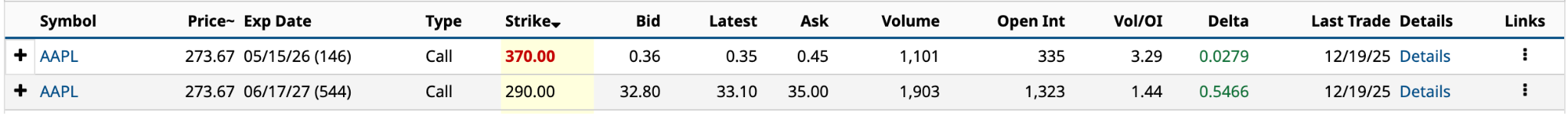 I’ve included two calls because of the enormous gap between the two ask prices. The $370 call’s $0.45 ask price is just 0.2% of its Dec. 19 closing share price. It needs only to increase by $16.13 (5.9%) to double your money by selling before next May. It’s unlikely to get anywhere near $370, whereas the $290 call is very reachable over the 18-month DTE.