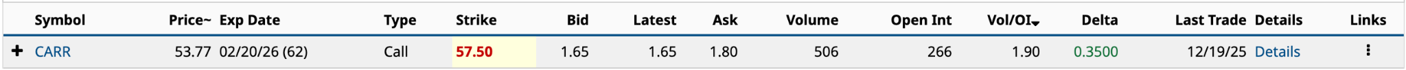 OTM (out of the money) by 6.5%, the $1.80 ask price is just 3.35% of its Dec. 19 closing share price. You can double your money by selling the call before expiration if the share price appreciates by $5.14 (9.6%) over the next two months. The expected move is $5.27, so it’s possible.