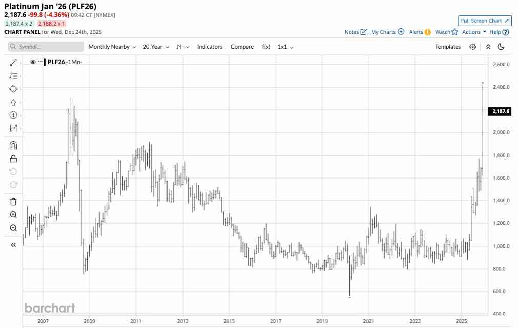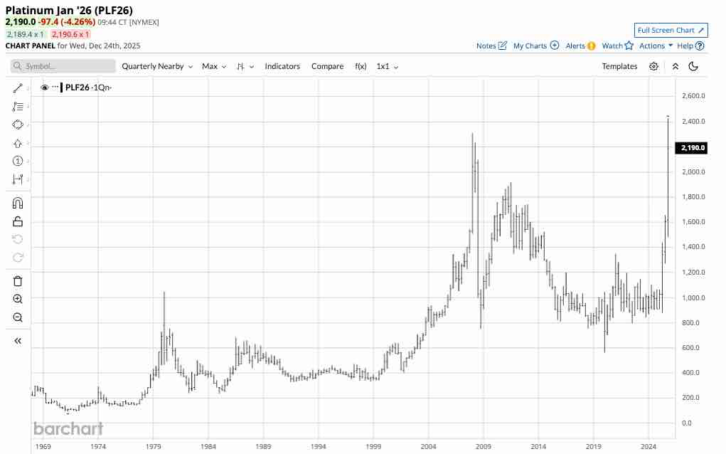 The quarterly chart shows that platinum futures formed a bullish key reversal pattern in Q2 2025 when the price traded below the Q1 2025 low and closed Q2 above the Q1 2025 high. Platinum futures have made higher highs in Q3 and Q4, and blew through all technical resistance levels at the Q3 2011 high of $1,918.50 in late 20235, and eclipsed the 2008 $2,308.80 record high price, rising to $2,425 per ounce on December 24.