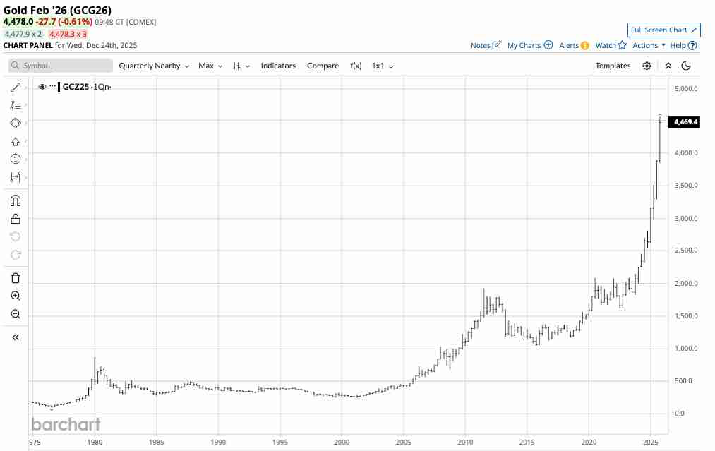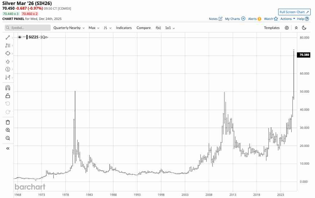 The quarterly chart shows that COMEX silver futures reached a new record high in Q4 2025, topping $72 per ounce in December.