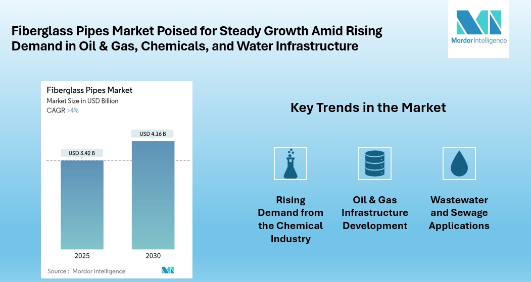 The global fiberglass pipes market is projected to grow steadily, reaching USD 4.16 billion by 2030, up from USD 3.42 billion in 2025, at a CAGR of over 4%. Fiberglass pipes market growth reflects the increasing adoption of fiberglass pipes across industries such as oil & gas, chemicals, agriculture, and sewage management.