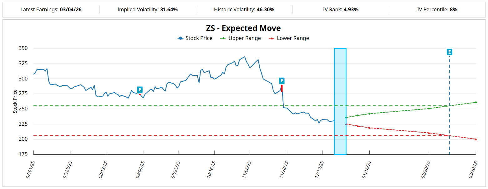 Based on the latest IV data, the market anticipates a sizable swing in ZS stock. Barchart’s Expected Move calculator reports a possible range between $210.48 and $250.56 for the Feb. 20 options chain. From a quantitative view, aggregate data suggests that Zscaler’s 10-week returns would likely range between $225 and $255, with price clustering occurring at $237.50.