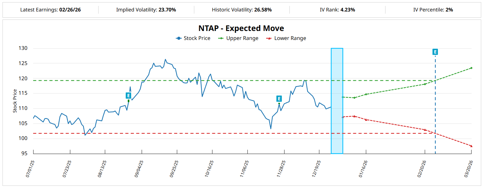 Based on IV levels, the market isn’t anticipating a huge move from NTAP stock. Per Barchart’s Expected Move calculator, NTAP could land between $102.95 and $118.08 for the options chain expiring Feb. 20, 2026. From a quantitative perspective, aggregate conditions would place NTAP’s 10-week returns between $109 and $115, with price clustering likely to occur around $112 (assuming an anchor price of $110.51).