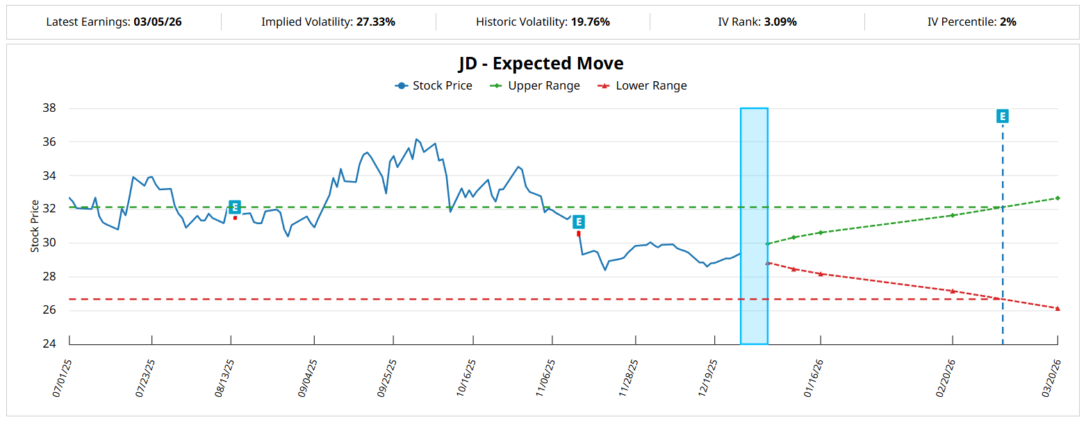 Barchart’s Expected Move calculator forecasts a range between $27.16 and $31.64 for the options chain expiring Feb. 20, 2026. Under aggregate conditions, 10-week returns for JD stock should usually land between $28.50 and $31, with price clustering occurring around $29.60 (assuming an anchor price of $29.40, Friday’s close).