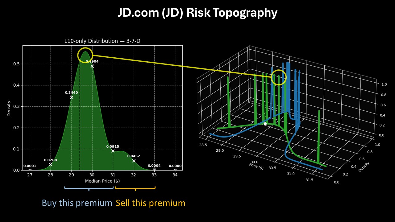 However, the current quantitative signal for JD stock is the 3-7-D sequence. In the past 10 weeks, JD printed only three up weeks, leading to an overall downward slope. While seemingly pessimistic, under this setup, the forward 10-week returns would typically range between $27 and $33, with price clustering predominant just below $30.