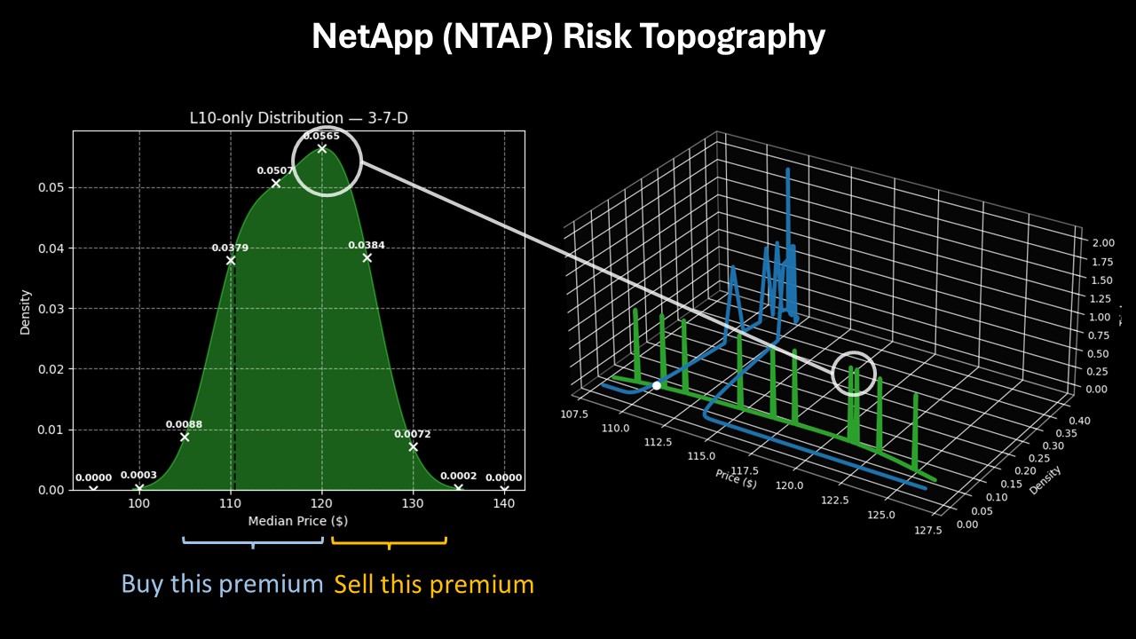 Looking at risk topography, peak density doesn’t actually show up at $120 exactly — that’s more of an approximate field using kernel density estimation (calculus). In reality, price behaviors tend to cluster between $120 and $122.50. That actually makes the 115/120 bull call spread expiring Feb. 20 very attractive.