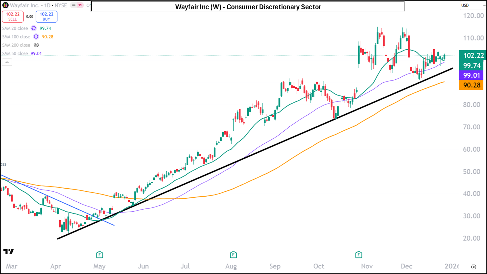 Over the past several weeks, Wayfair has been digesting a strong prior advance, trading sideways to slightly higher after pulling back from recent highs. W has held above its rising trendline and key moving averages, with buyers stepping in on dips and preventing deeper follow-through to the downside. The action suggests consolidation within an ongoing uptrend, as momentum cools but underlying support remains intact.