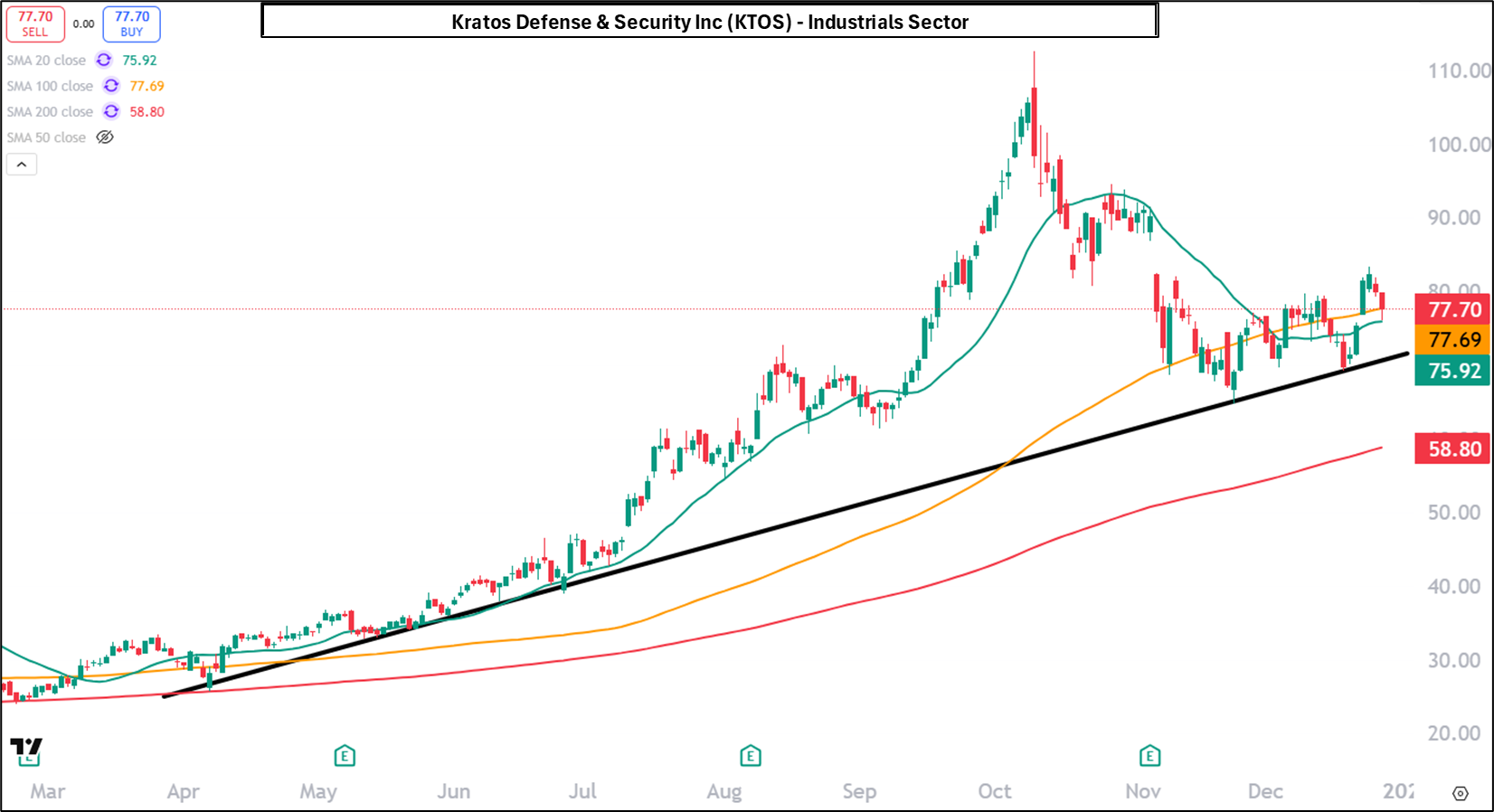 Over the past several weeks, KTOS has been stabilizing after a sharp pullback from its peak, shifting from downside momentum into a choppier, constructive consolidation. Price has held above the rising longer-term trendline while reclaiming the 20-day moving average, suggesting buyers are defending support rather than exiting. The action reflects repair and base-building, with volatility compressing as the stock works to establish a firmer footing after the prior surge and correction.