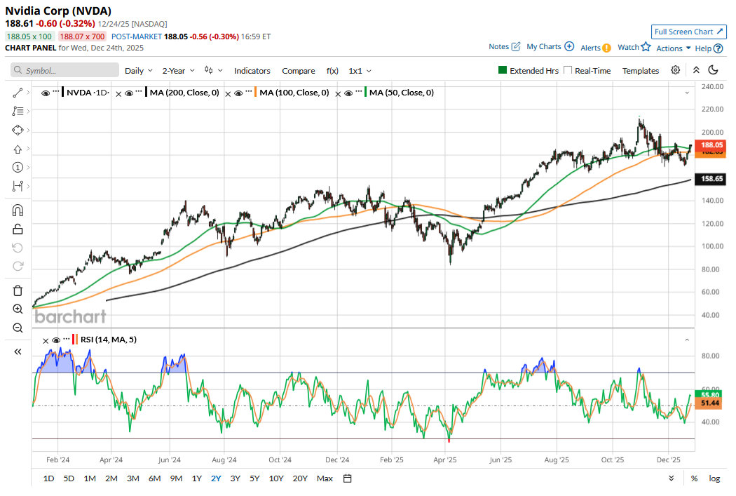 Nvidia stock was quite volatile this year and plunged to $86.62 on April 7 amid U.S. President Donald Trump’s tariffs. The rebound was also quick, though, and the stock has more than doubled from its 2025 lows even as it is down 11.37% from the record high of $212.19 in late October.
