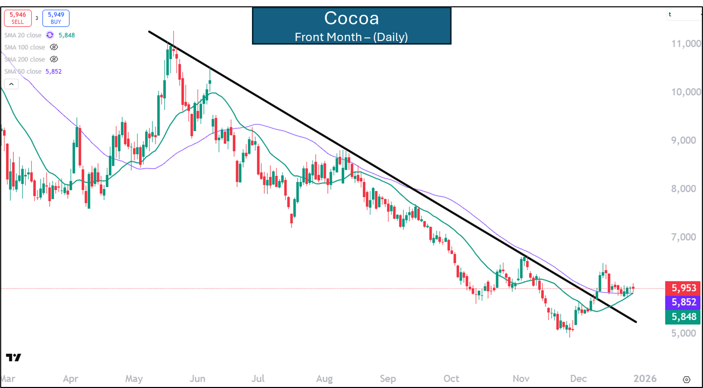 The accompanying chart adds important context to the flow story. For much of the past year, cocoa traded within a well-defined downward trend, with rallies consistently capped by a descending trendline and the 50- and 100-day moving averages. That trendline defined seller control. Over the past few weeks, that structure has changed.