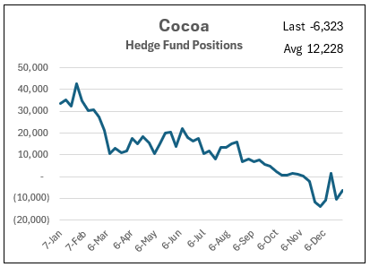 Another factor reinforcing the upside risk is speculative positioning. Despite the recent rally, hedge funds remain meaningfully under-positioned in cocoa. Current estimates show hedge funds net short approximately 6,323 contracts, a stark contrast to the 52-week average net long position of about 12,228 contracts. In other words, positioning is nearly 18,000 contracts lighter than average, even as prices have already begun to respond to anticipated index flows.