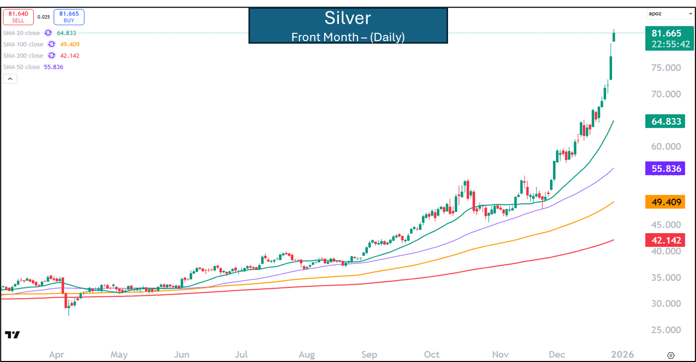 From a technical standpoint, silver’s recent advance qualifies as a parabolic move rather than a routine breakout. Price has: