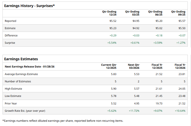 The industrial company is expected to announce its fiscal Q4 2025 earnings results soon. Ahead of this event, analysts expect TDY to report an adjusted EPS of $5.83 per share, up 5.6% from $5.52 in the year-ago quarter. It has consistently exceeded Wall Street's earnings expectations in the past four quarters.