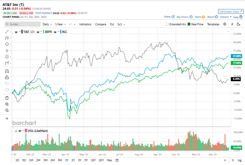 T shares have climbed 7.4% over the past year, trailing the S&P 500 Index’s ($SPX) 14.8% gains and the Communication Services Select Sector SPDR ETF’s (XLC) 19.1% uptick over the same time frame.