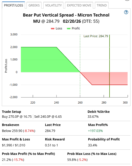 If Micron stock closes above $270 on the expiration date the trade loses the full $1,010.