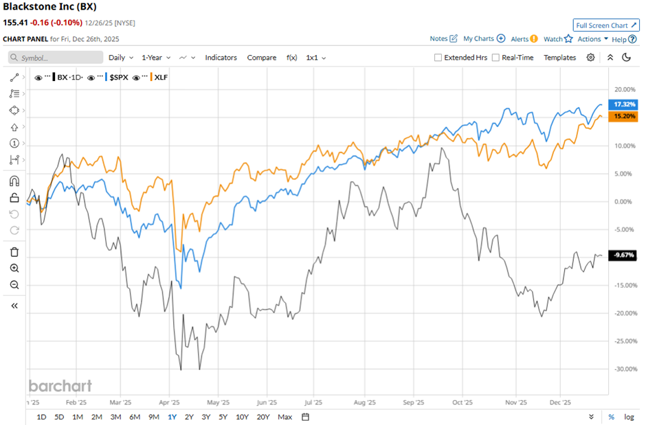Shares of Blackstone have decreased 11.9% over the past 52 weeks, underperforming both the S&P 500 Index's ($SPX) 14.8% gain and the State Street Financial Select Sector SPDR ETF's (XLF) 13.3% return over the period.