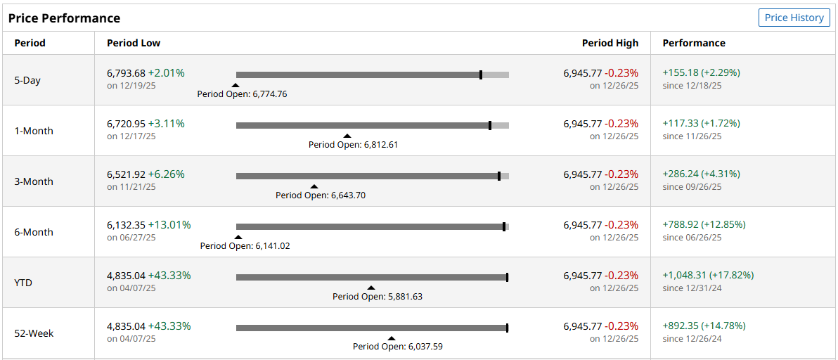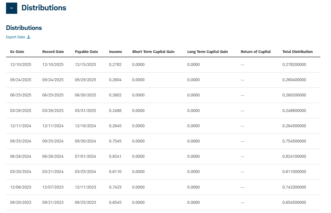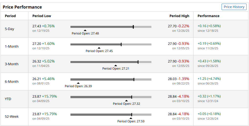 As you can see, it barely broke over 5% in all short-term monitoring periods. If we take the 52-week performance (0.18%) and add the total distribution percentage from 2025 ($1.05, or 3.80% as of the last closing price), we get a total return of less than 4%.