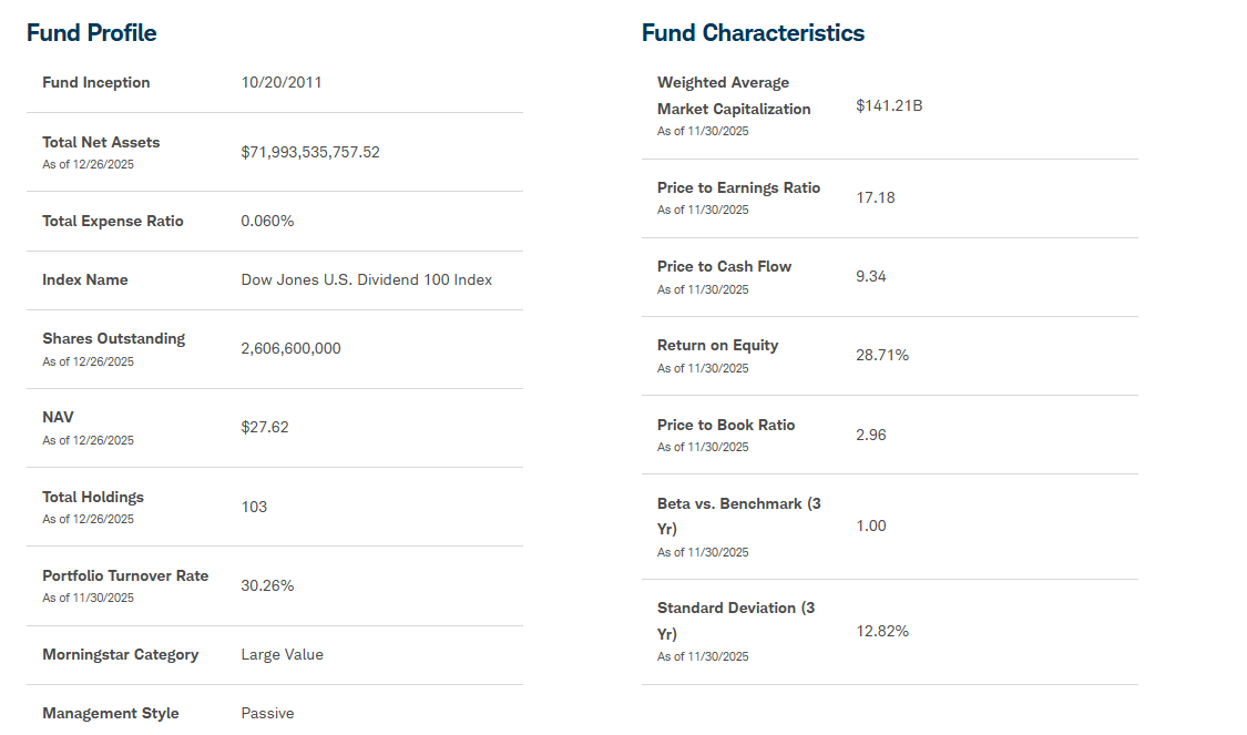 The fund holds just shy of $72 billion in assets as of December 26, 2025. It has about 2.6 billion shares outstanding, and has a net asset value (NAV) of $27.62 (per share). The NAV is calculated by taking a fund's total assets, subtracting its total liabilities, and dividing the result by the number of outstanding shares. The metric is the ETF's “fair value” and is a key guiding metric for investors. If the ETF is trading above its NAV, it’s trading at a premium and might be expensive. If it’s below, then it’s a discount and might be cheap.