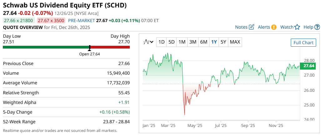 For reference, here is SCHD’s performance from the last five days to the last 52 weeks (not including dividend distributions):