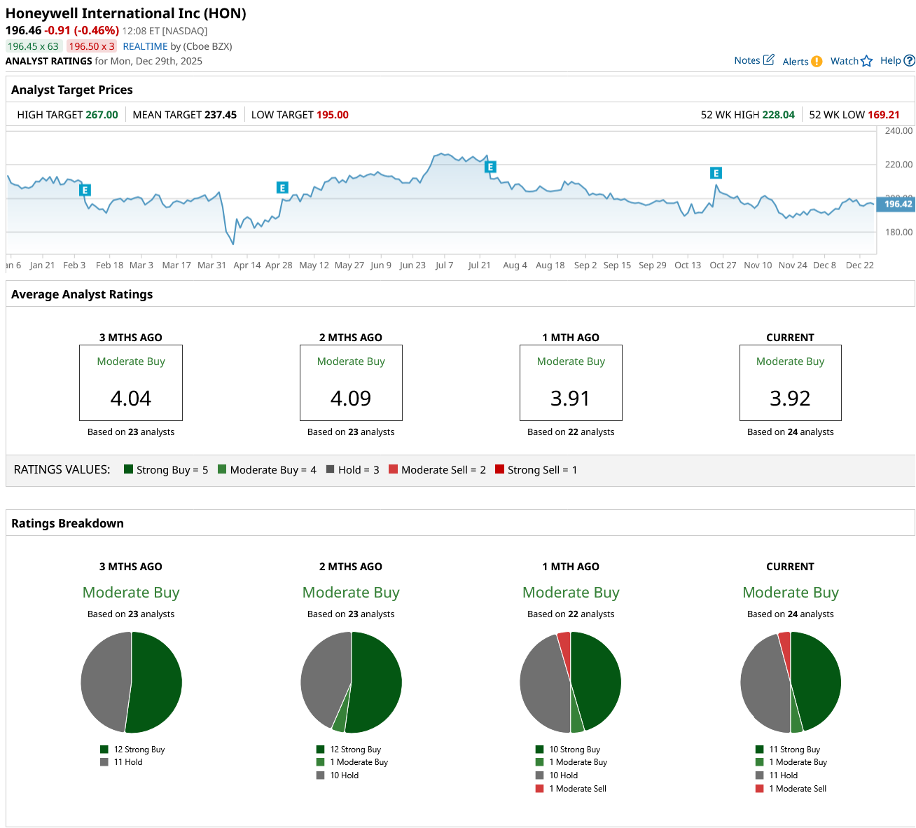 Out of the 24 analysts covering HON stock, 11 recommend “Strong Buy,” one recommends “Moderate Buy,” 11 recommend “Hold,” and one recommends “Moderate Sell.” The average HON stock price target is $237.45, above the current price of $196.