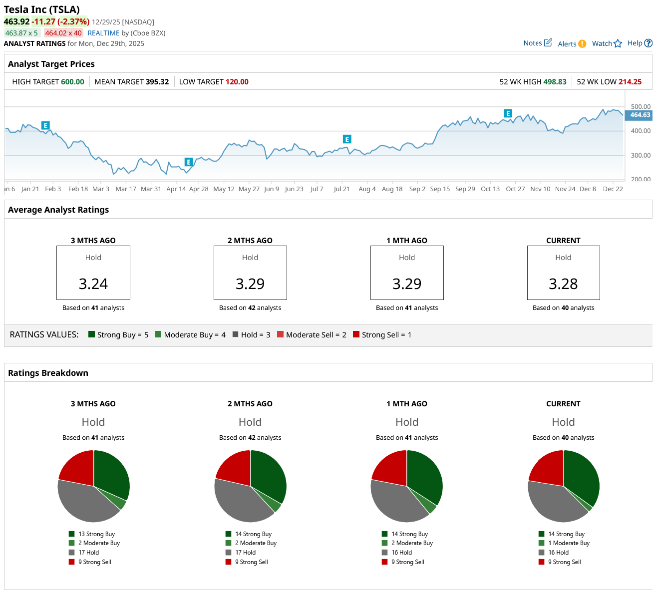 Meanwhile, Wall Street analysts remain split on Tesla. Of the 40 analysts covering the stock, 14 give it a “Strong Buy” rating, one assigns a “Moderate Buy,” 16 recommend holding, and nine rate it a “Strong Sell.” This results in a consensus “Hold” rating. TSLA shares currently trade well above their average price target of $395.32, though they still offer solid upside potential to the Street-high target of $600.