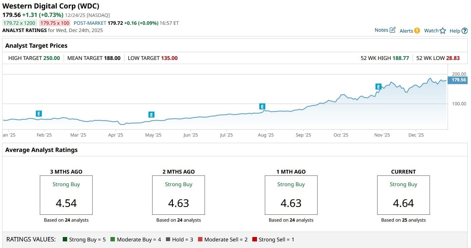 Still, Morgan Stanley analysts believe the Nasdaq-listed firm will push higher in 2026. Last week, they maintained their “Overweight” rating and $228 price objective on WDC stock.