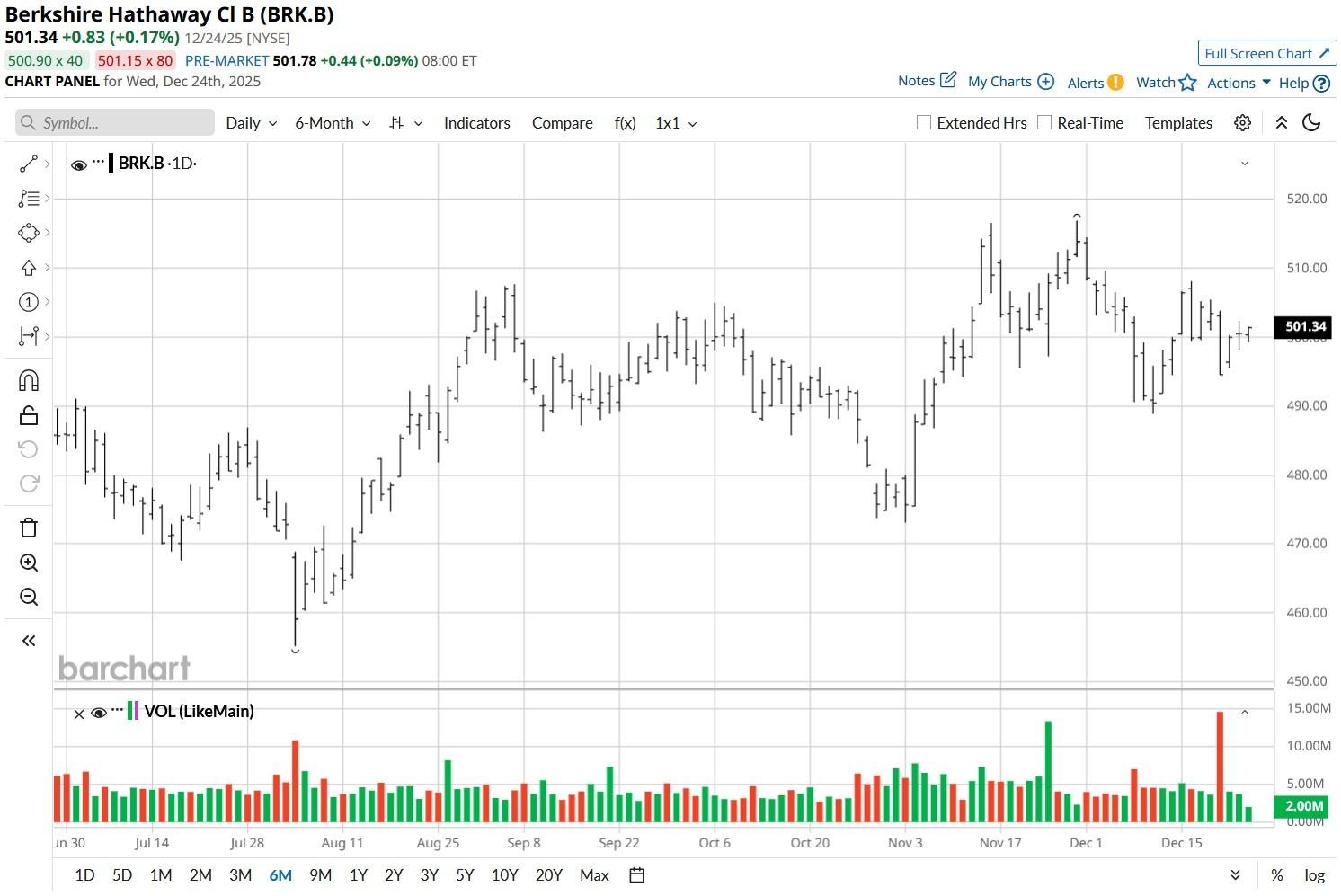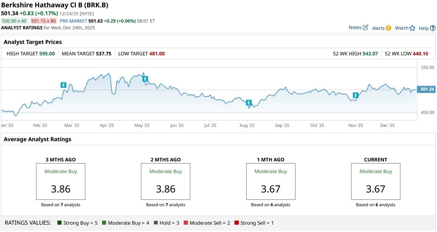 According to Barchart, the consensus rating on BRK.B currently sits at “Moderate Buy” with price targets going as high as $595 indicating potential upside of another 19% from here.